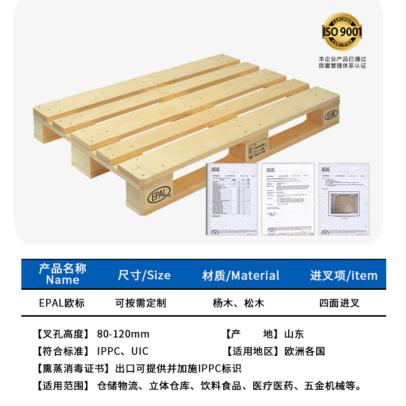 3.生产厂家需通过ISO认证和海关备案的lPPC处理资质,方能生产;加入欧托认证,所生产托盘方可在欧托系统中流通。