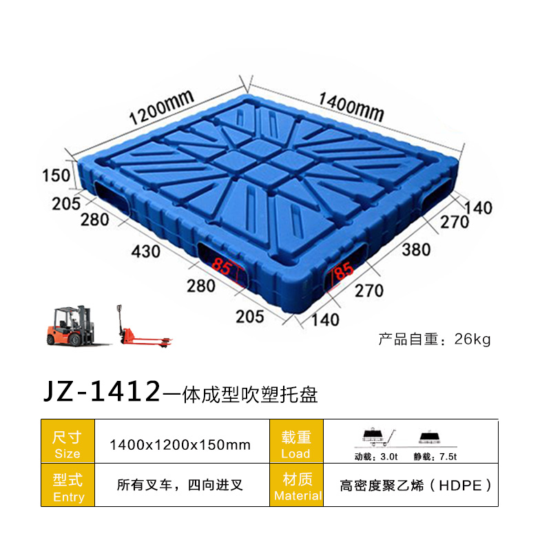双面吹塑托盘采用吹塑成型工艺,通常需要使用大型的中空成型机进行生产。这种托盘的设计允许其正反两面均可使用,因此被称为双面塑料托盘。双面吹塑塑料托盘的优点包括承载能力强、使用寿命长,这得益于其内部设计了X轴向纬筋、Y轴向纵筋、Z轴向竖筋,以及内部至少包含两个支撑架,面板的两头向内折回,从而增强了其承载
