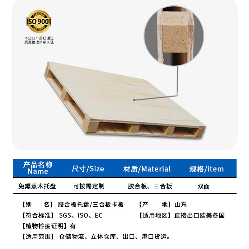 与熏蒸木托盘(实木托盘)相比,免熏蒸木托盘(胶合板托盘)具有以下特点: