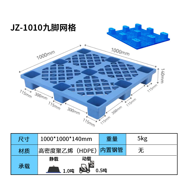 九脚网格塑料托盘的九脚网格托盘其底部是有‘九个腿’组成的,表面为‘网格’状,顾行业为方便称其为九脚网格托盘,九脚网格托盘大多型号的都为轻型的塑料托盘,不易用于上货架或者较重货物的周转使用,大多情况下九脚网格塑料托盘都是用来仓库货物垫仓板防潮使用,对于轻型货物的周转也可。