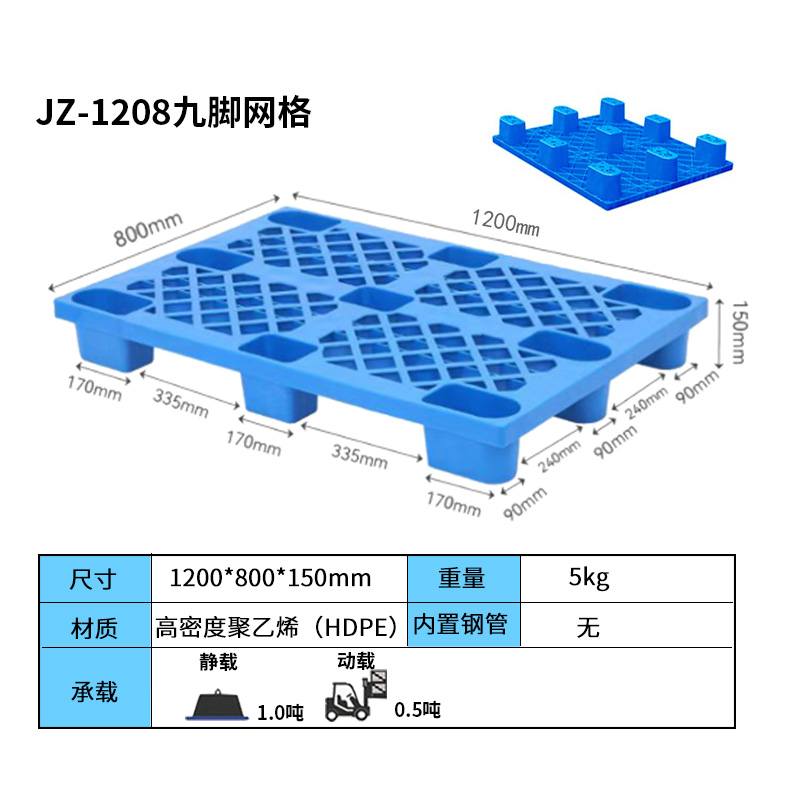 九脚网格塑料托盘的九脚网格托盘其底部是有‘九个腿’组成的,表面为‘网格’状,顾行业为方便称其为九脚网格托盘,九脚网格托盘大多型号的都为轻型的塑料托盘,不易用于上货架或者较重货物的周转使用,大多情况下九脚网格塑料托盘都是用来仓库货物垫仓板防潮使用,对于轻型货物的周转也可。