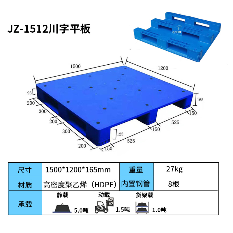 尺寸:1500*1200mm川字平板塑料托盘川字平板塑料托盘因其承载能力强、稳定性好,被广泛应用于仓储和物流行业中,用于存储和运输各种货物。其标准化设计使得托盘能够方便地堆叠和搬运,提高了仓储和物流的效率。
