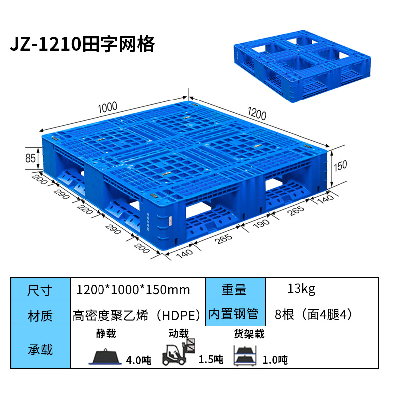 田字设计,双层加强受力,增加托盘受力强度,使受力更加均匀,结构牢固,不易变形。完美无障碍平地堆码,叠放易于整理存放,也可节约存储空间,符合空间资源合理配置要求。可四向进叉,操作方便,多面进叉可防止托盘变形,增加使用寿命网格表面在产品置放部位安装防滑块,提高产品使